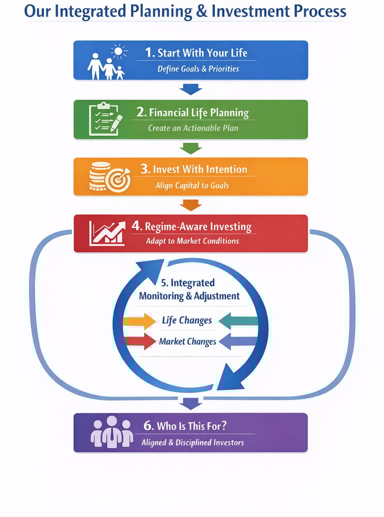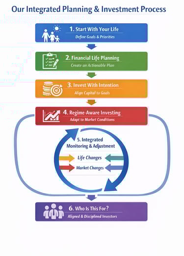 We integrate financial life planning with institutional-grade, regime-aware investing by creating a personalized framework built for long-term clarity and confidence.