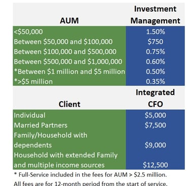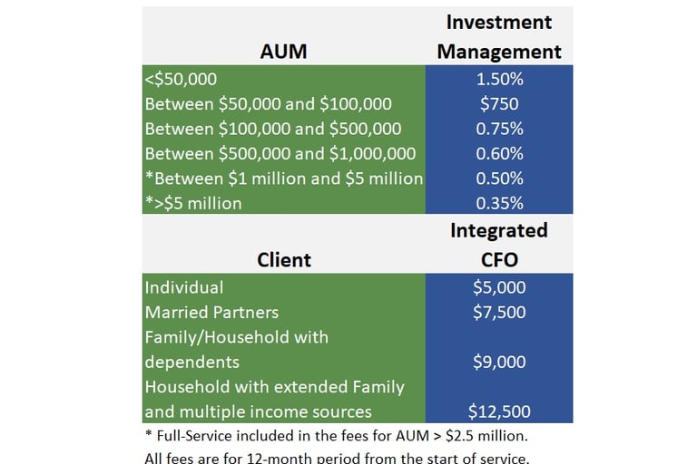 Our fee structure is intentionally designed around two clearly defined services: dedicated investment management and our comprehensive, integrated CFO advisory service. By separating these services, we provide complete transparency while allowing you to engage at the level of strategic support that aligns with your financial priorities and complexity of needs.